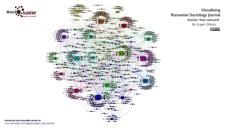 Cine și când a publicat în, argumentativ, cea mai bună/cunoscută revistă de sociologie din România? Un grafic realizat din perspectiva vizualizării rețelelor de date a publicisticii apărute în revista Sociologie Românească în perioada 1990-2010. Realizat cu Sci2 și Gephi, graficul interactiv pune în relație autorul cu anul de apariție. Puteți căuta și selecta un autor și alege un nod pentru a urmări rețeaua acestuia. Aveți posibilitatea de a selecta un anumit modul și este disponibilă funcția de zoom. Acesta este un prim grafic interactiv dintr-o serie care va cuprinde informații despre tema articolelor, cuvintele cheie, orașul de reședință al autorului sau afilierea instituțională.